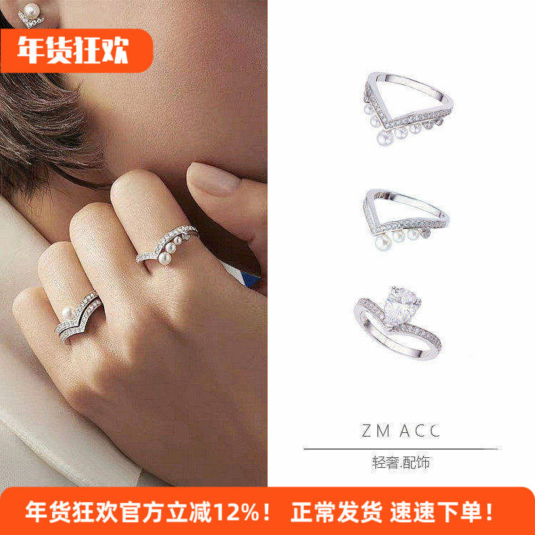 约瑟芬加冕爱白鹭冠冕V字形珍珠皇冠S925纯银叠戴戒指婚戒女指环