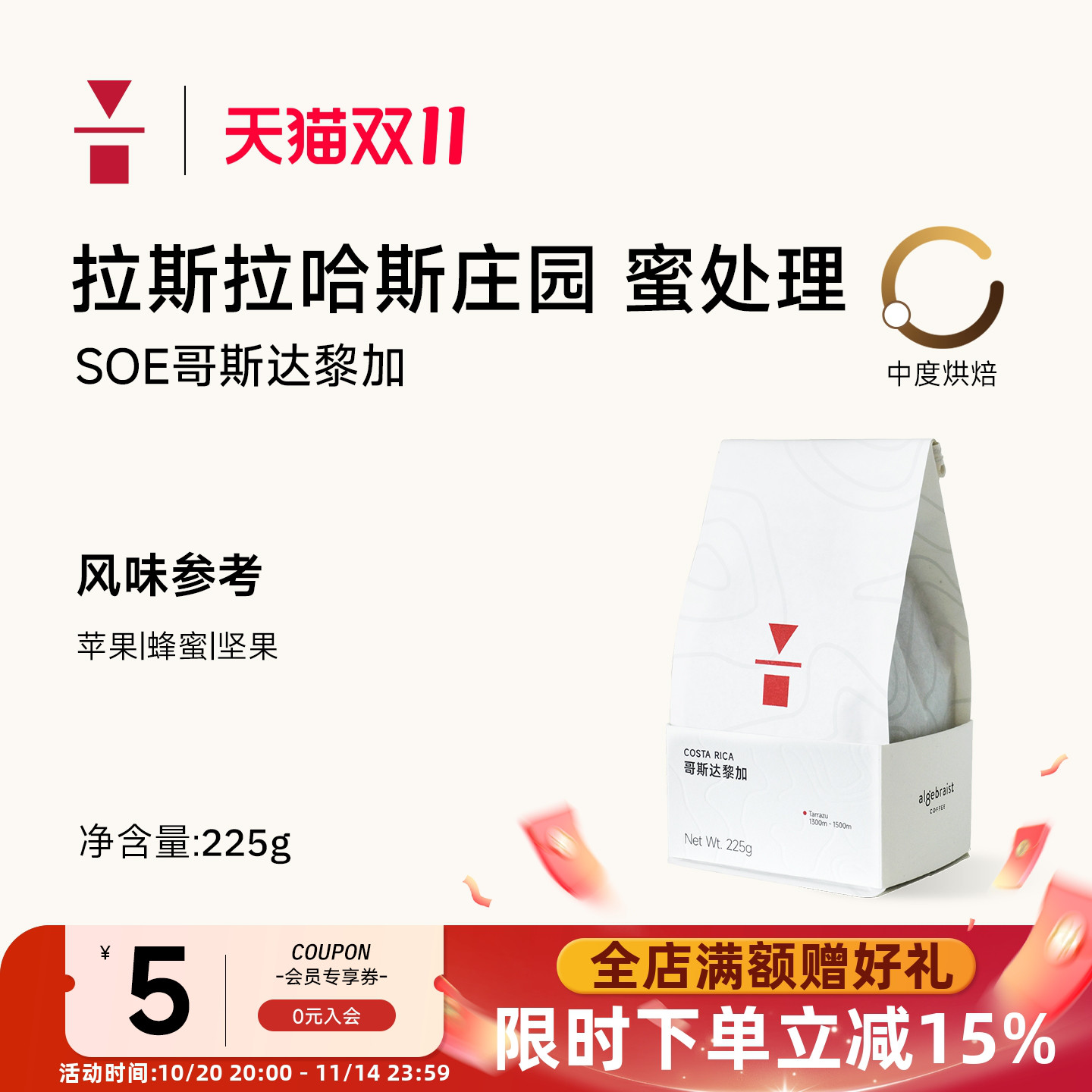 代数学家哥斯达黎加蜜处理225g精品手冲新鲜咖啡豆水果香中度烘焙