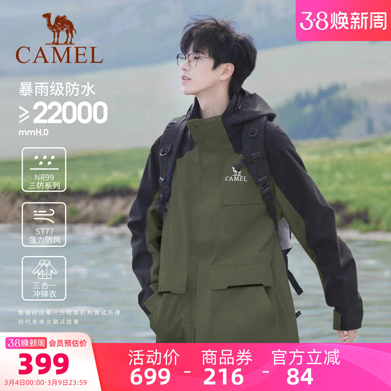骆驼风暴工装冲锋衣男女款三合一可拆卸外套防风防水加绒加厚外套