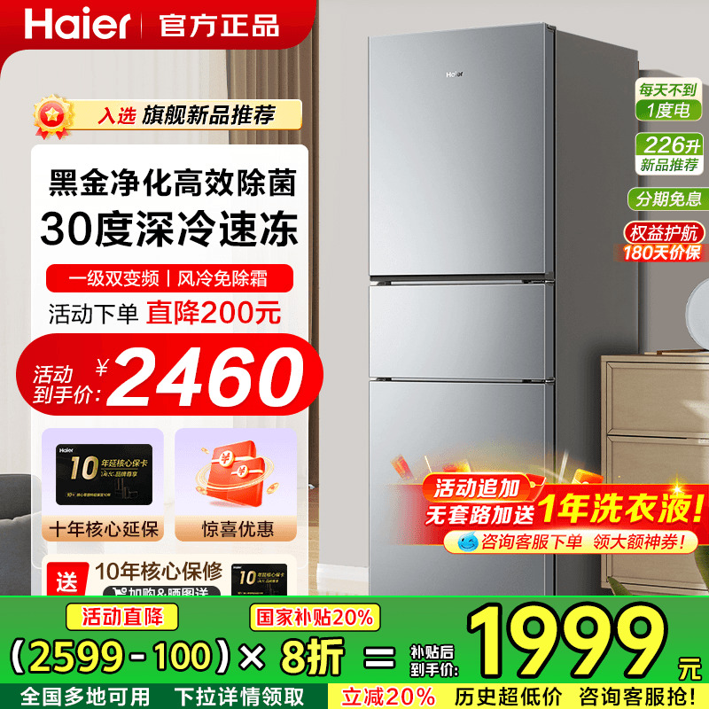 [政府补贴]海尔电冰箱226L无霜家用小型双门三门变频283L一级能效