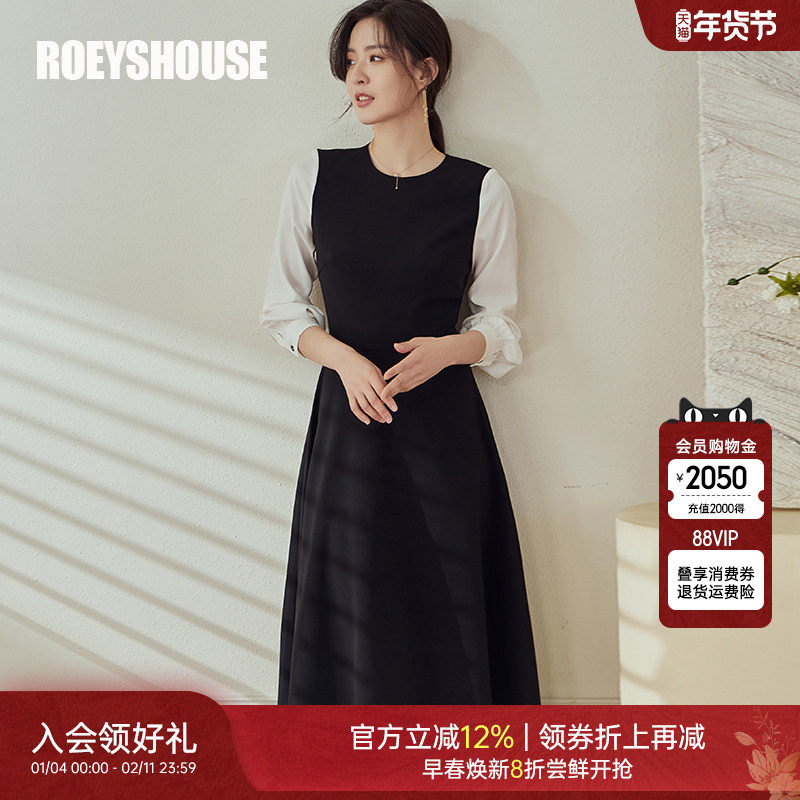 罗衣简单大方拼接大摆连衣裙女春季职场通勤圆领显瘦中长裙02729