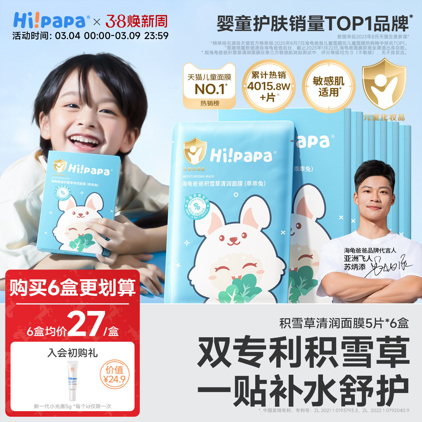 海龟爸爸儿童面膜女孩宝宝专用小兔子补水保湿男孩子青少年护肤品