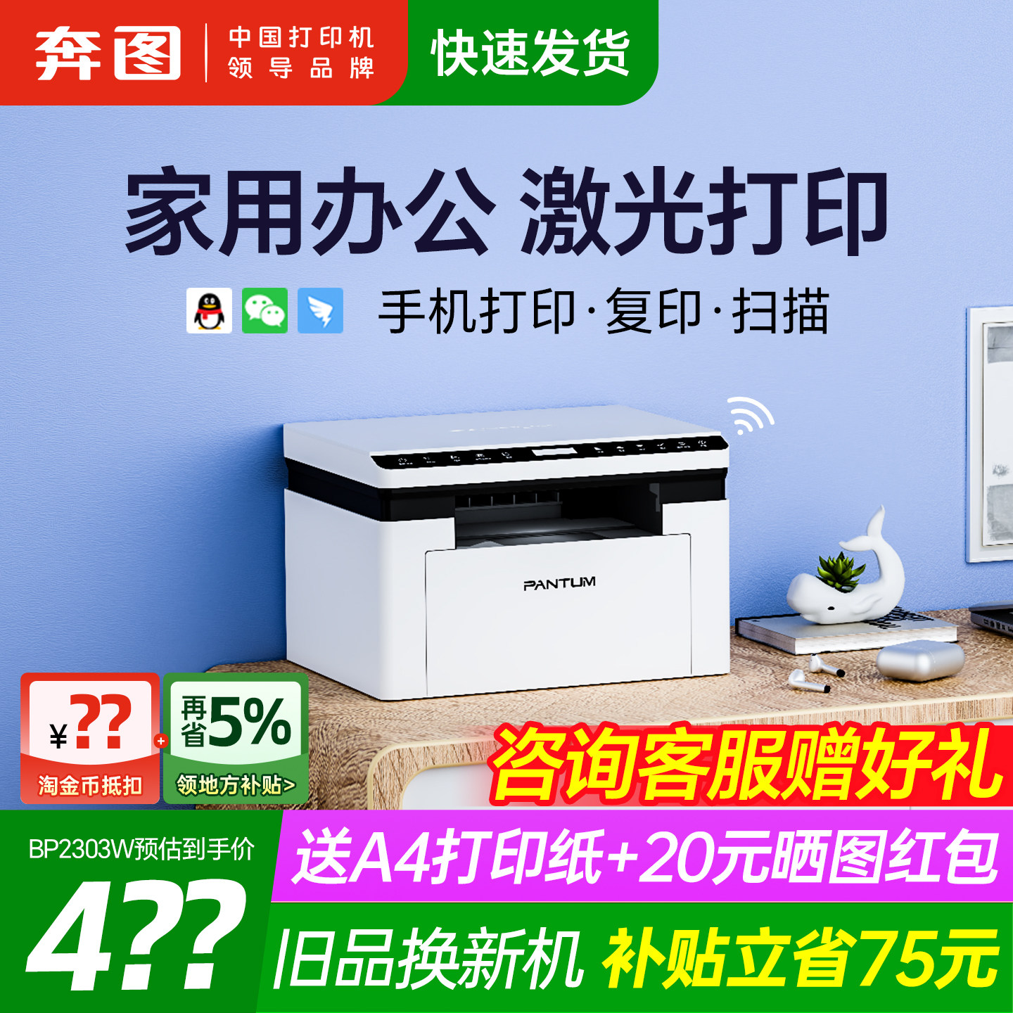 奔图旗舰店bm2303w黑白激光打印机复印扫描一体机手机无线学生家用小型家庭作业