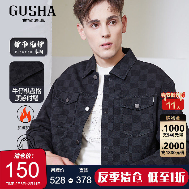 【棋盘格/阔版】古鲨黑色格子牛仔外套男潮流宽松时尚夹克2025冬