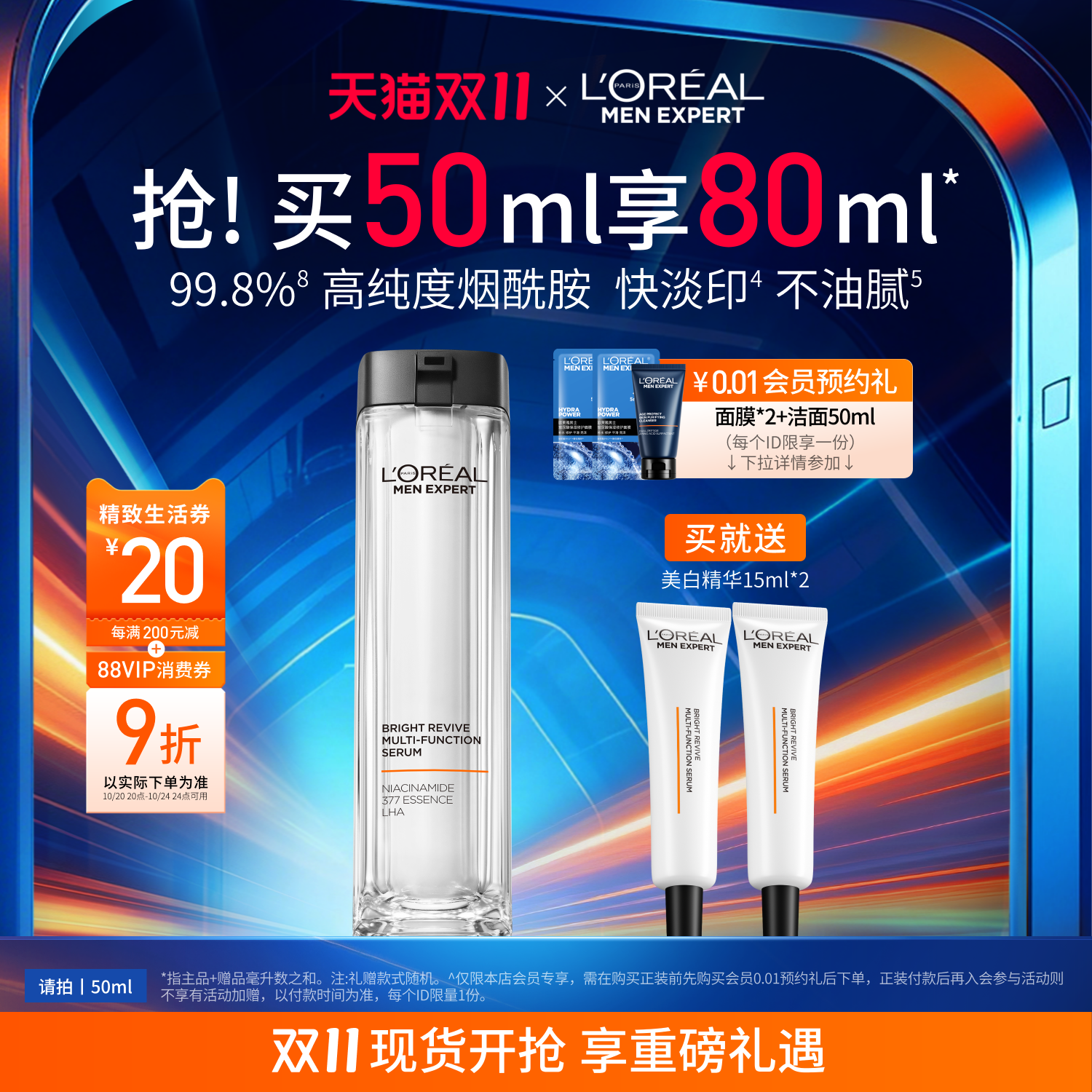 • 泡美丽»»【双11立即抢购】欧莱雅男士耀白瓶精华液美白淡痘印淡斑护肤品