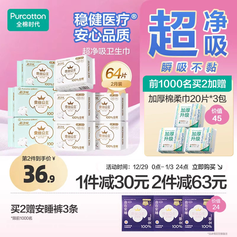优于新国标 全棉时代奈丝公主纯棉卫生巾超薄日夜组合2月装64片
