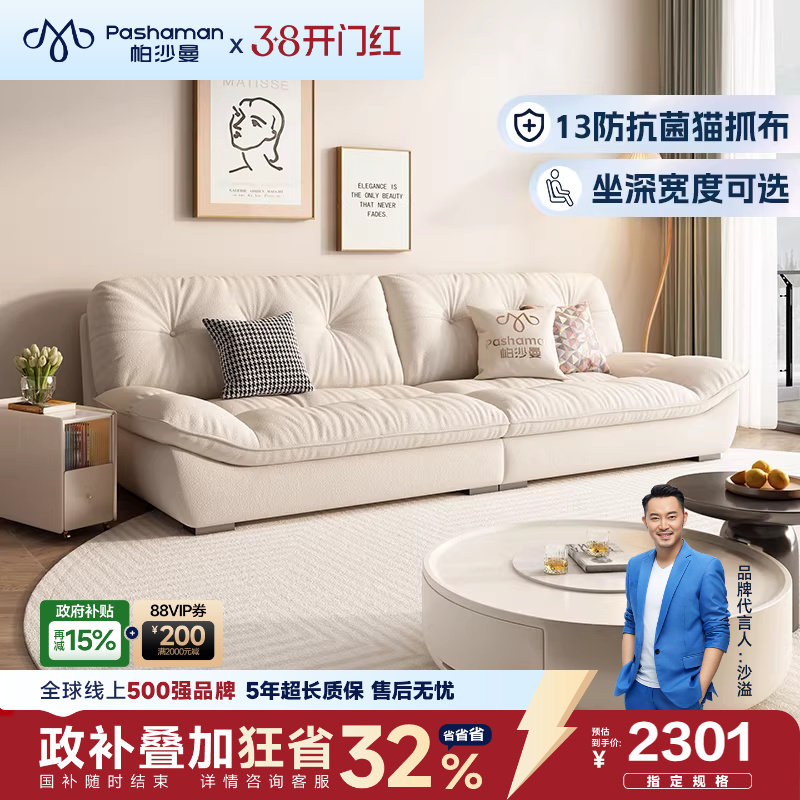 帕沙曼云朵沙发客厅现代简约小户型直排奶油风布艺沙发猫抓布抗菌