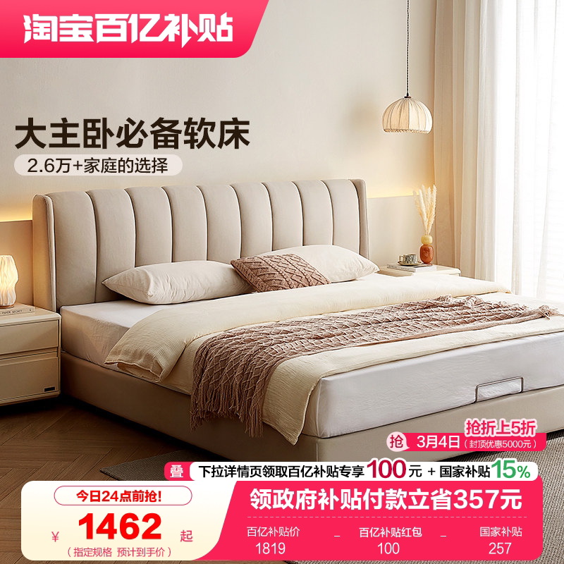 全友家居奶油风琴键双人大床主卧室软包床科技布艺高箱储物落地床