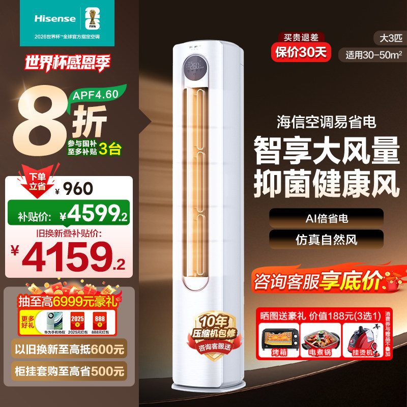 补贴全国 海信大3匹易省电空调柜机一级变频家用立式客厅柜式冷暖