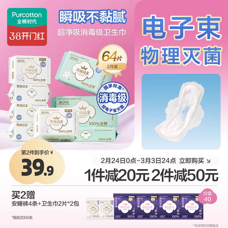 全棉时代奈丝公主消毒级纯棉卫生巾超薄日夜组合2月装64片