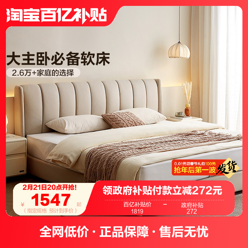 全友家居奶油风琴键双人大床主卧室软包床科技布艺高箱储物落地床