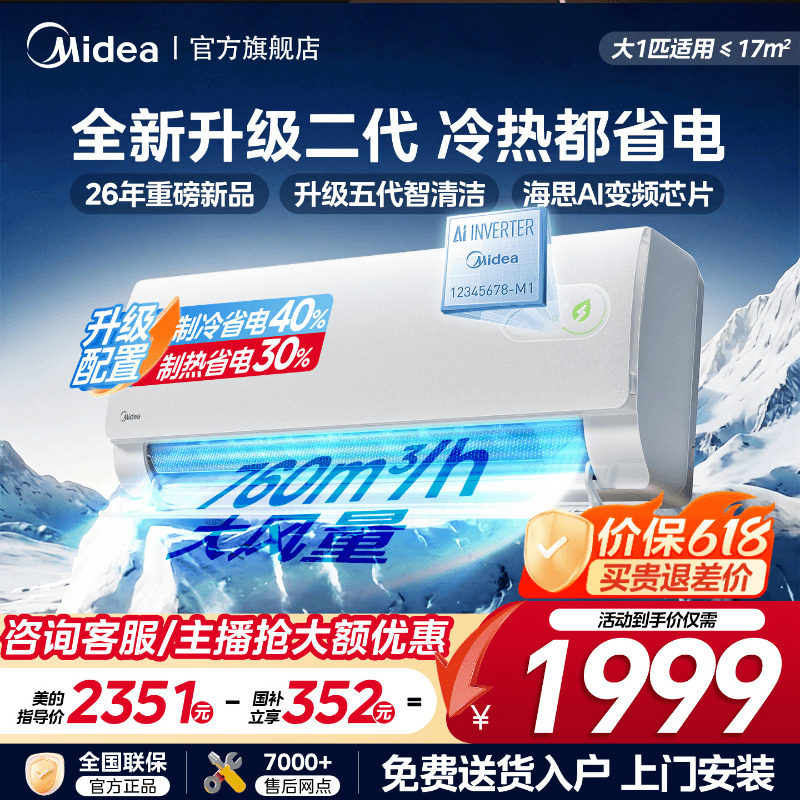 [新品]美的空调大1.5匹1匹一级家用酷省电二代挂机官方旗舰店正品