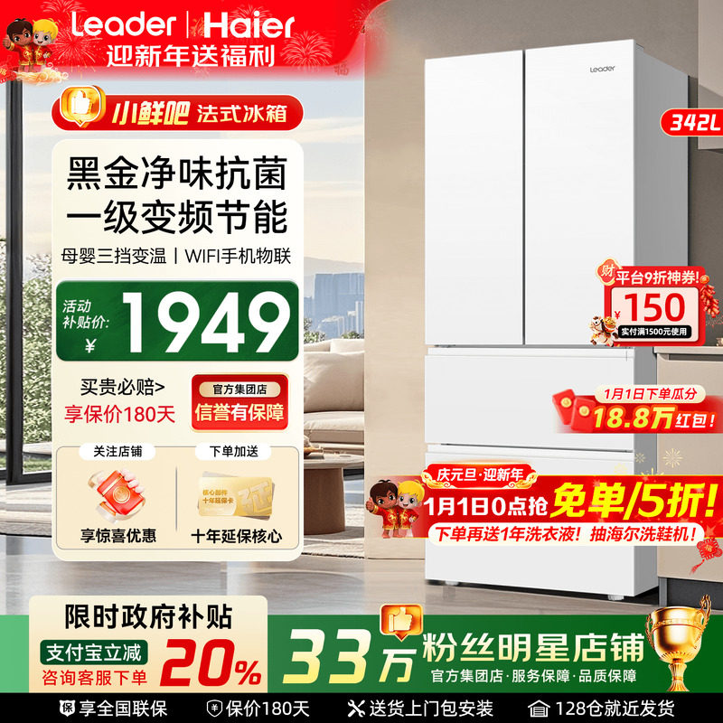 国补20%]海尔电冰箱342L家用法式四开门统帅一级能效变频无霜旗舰
