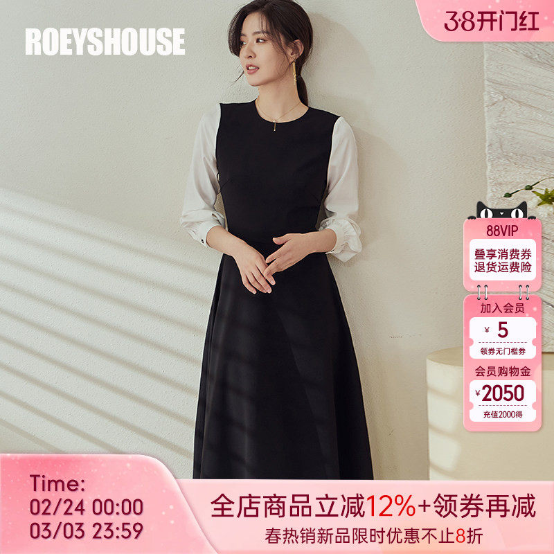 罗衣简单大方拼接大摆连衣裙女春季职场通勤圆领显瘦中长裙02729