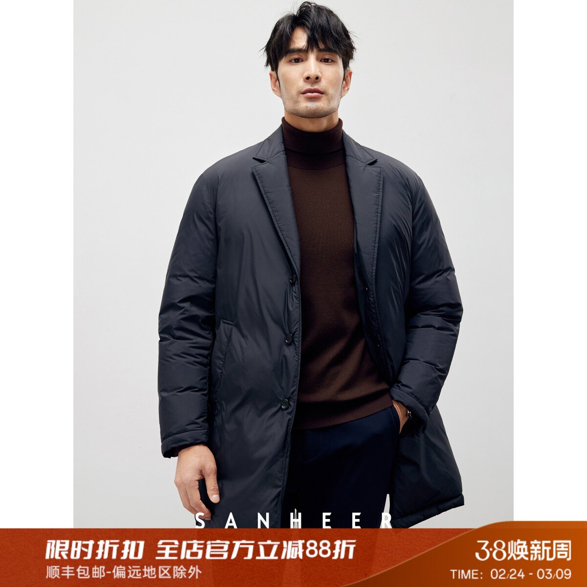 绅士的冬季 高蓬松保暖白鹅绒男士西装领中长款羽绒服外套 DAD294