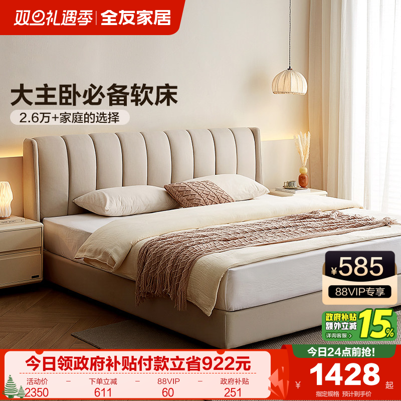 全友家居奶油风琴键双人大床主卧室软包床科技布艺高箱储物落地床