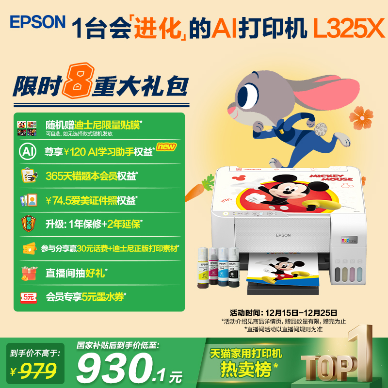 【政府补贴】爱普生L3251/L3253迪士尼系列墨仓式打印机彩色无线WIFI复