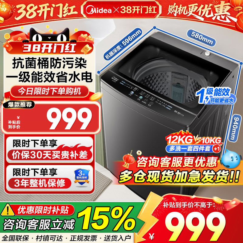 全民补贴美的波轮洗衣机12KG家用租房除螨抗菌全自动洗脱一体