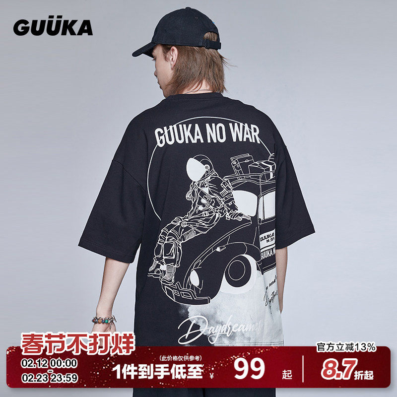 GUUKA潮牌黑色短袖T恤男夏情侣嘻哈后背宇航员印花运动五分袖宽松