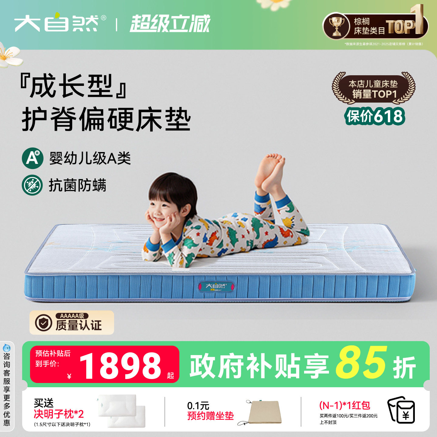 政府补贴15%大自然5A级儿童家用护脊山棕床垫软硬抑菌防螨青少年