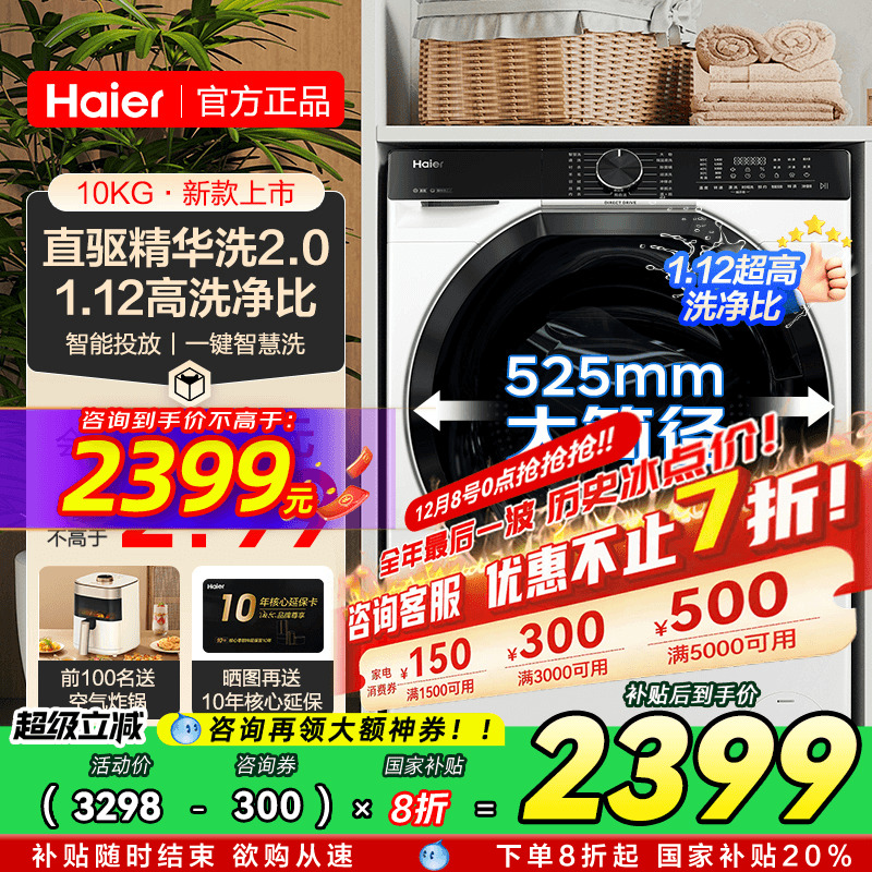 【云溪3.0】海尔579滚筒洗衣机直驱精华洗10公斤家用超薄77E旗舰