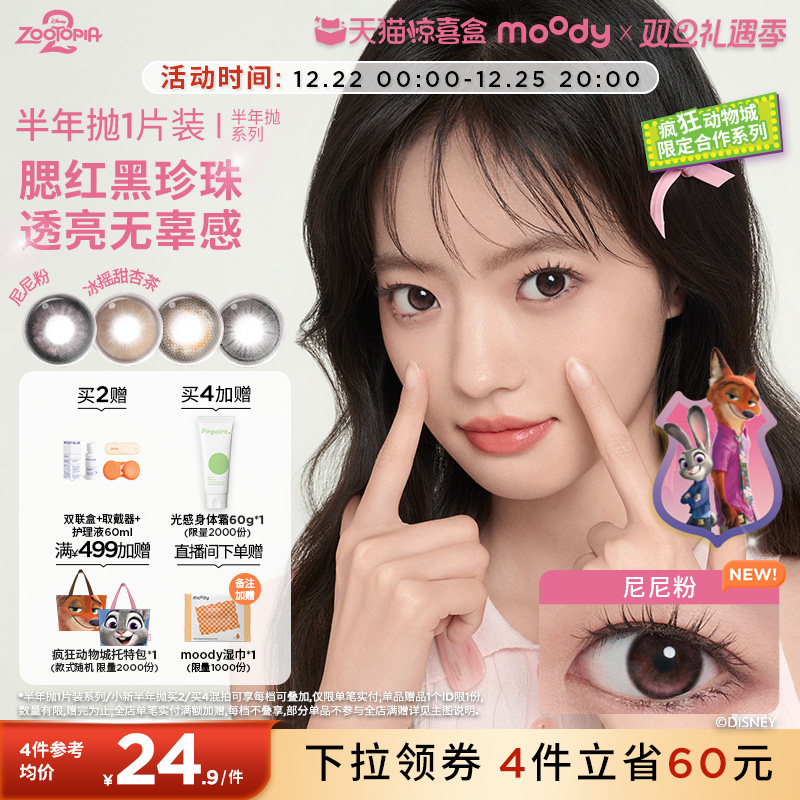moody美瞳半年抛疯狂动物城2尼尼粉色彩色隐形眼镜官方正品1片