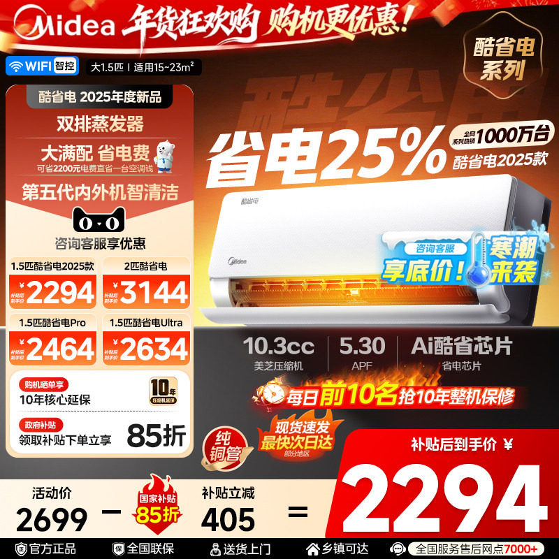 【政府补贴】美的空调酷省电2025版一级大1.5匹2匹变频冷暖挂机