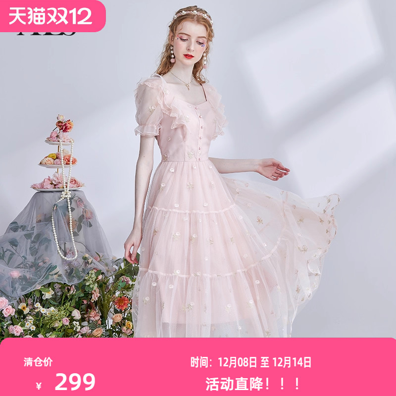 艾丽丝2025夏季新款粉色甜美温柔公主裙花边网纱拼接中长款连衣裙