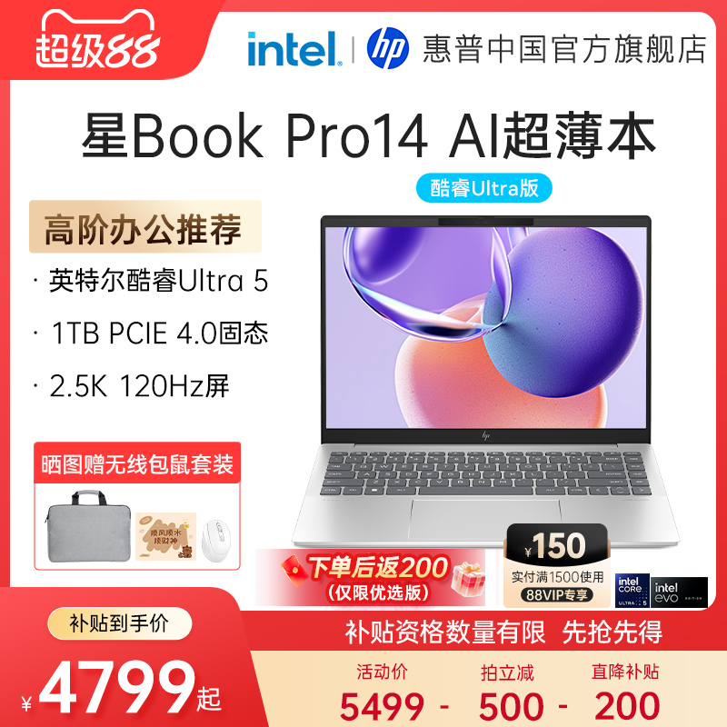 【爆款笔记本】HP惠普可选星Bookpro14英特尔酷睿Ultar5/7 高清屏