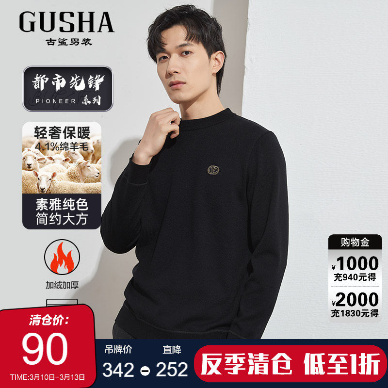 【绵羊毛】古鲨黑色中领卫衣男士商务高端加绒加厚打底衫冬装