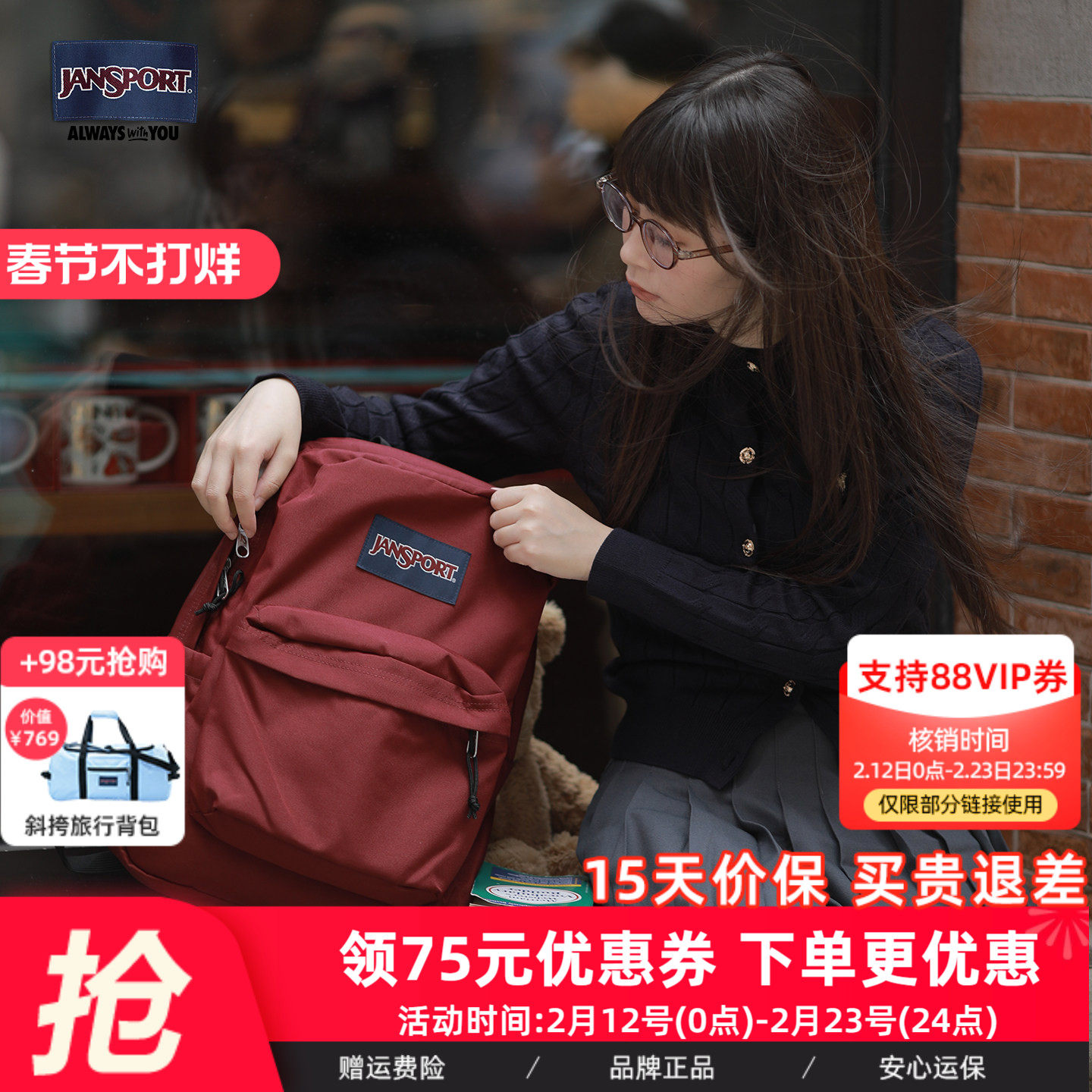 JanSport双肩包女大初高中小学生经典黑复古红CP书包红茶风电脑包