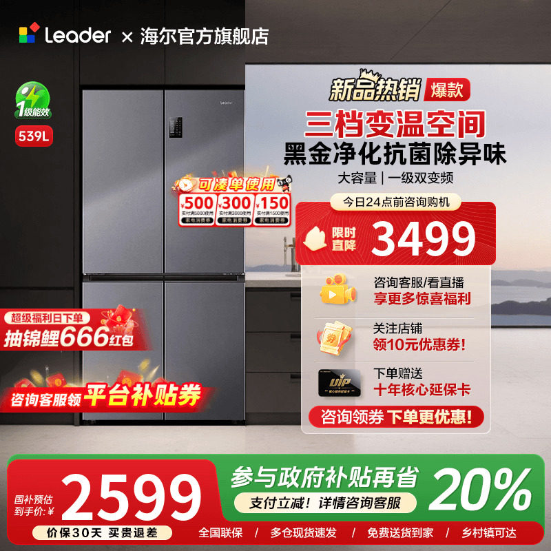 海尔出品统帅539L十字对开四门家用一级能效变频无霜大容量电冰箱
