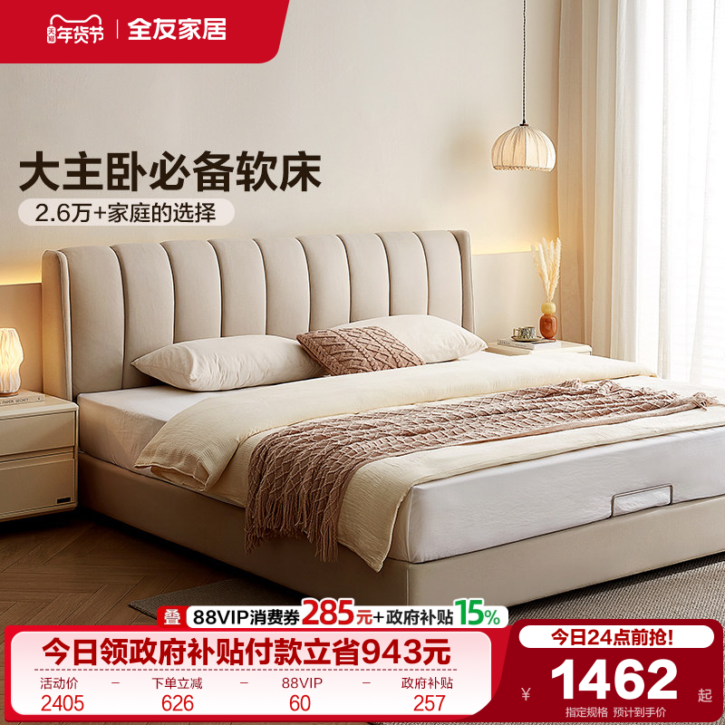 全友家居奶油风琴键双人大床主卧室软包床科技布艺高箱储物落地床