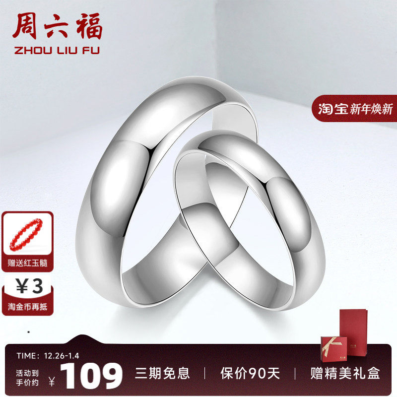 周六福S925纯银情侣一对戒指男女简约素圈纪念生日礼物送女友礼物