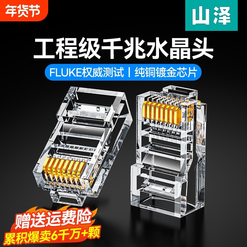 山泽水晶头超五5类超六6类7七类千兆纯铜屏蔽网线插头家用对接头