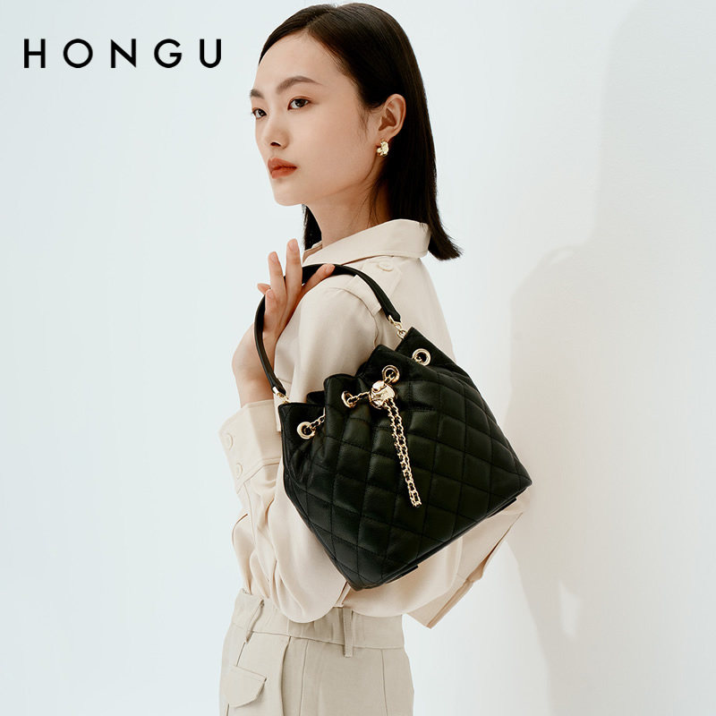 红谷女包2025春夏新款小香风菱格头层牛皮单肩包时尚抽绳水桶包包