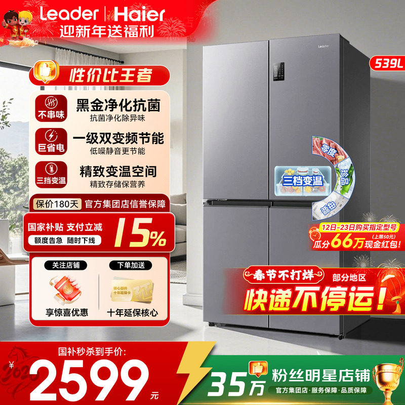 国补15%]海尔冰箱539L升超大容量统帅家用一级变频十字四门旗舰店