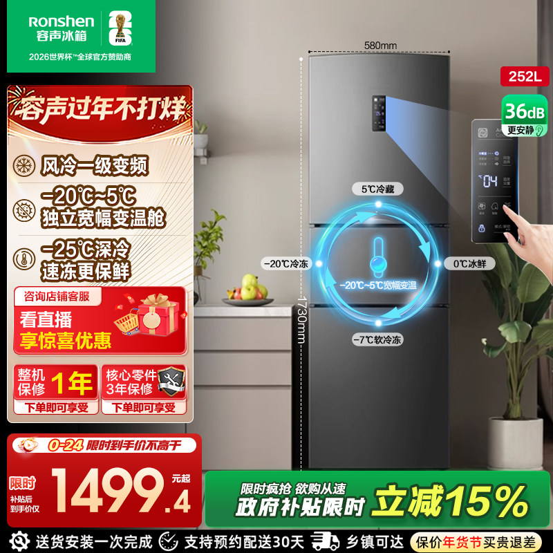 容声252/253L三门冰箱风冷无霜变频一级能效家用小型租房换新补贴