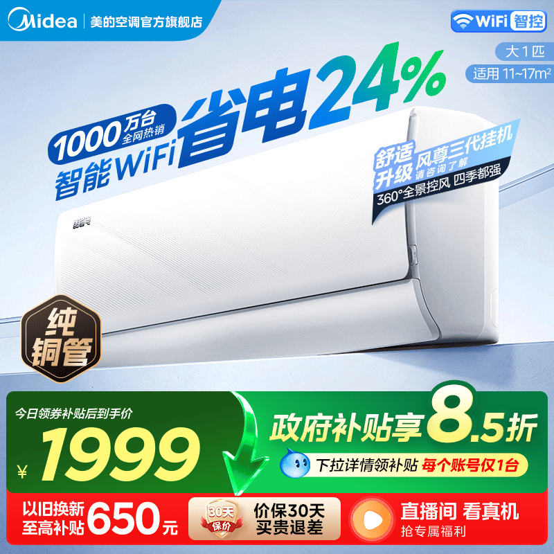 美的官方正品空调家用一级卧室大1匹变频冷暖挂机酷省电