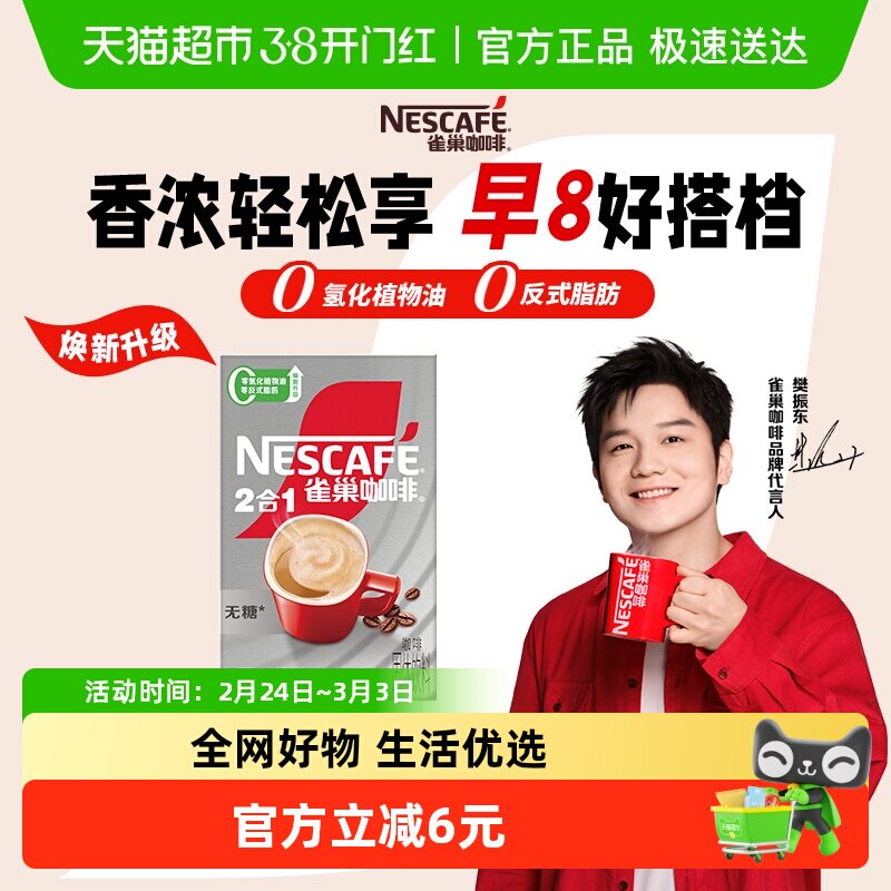 【樊振东同款】雀巢咖啡速溶1+2三合一无蔗糖添加即溶办公咖啡饮