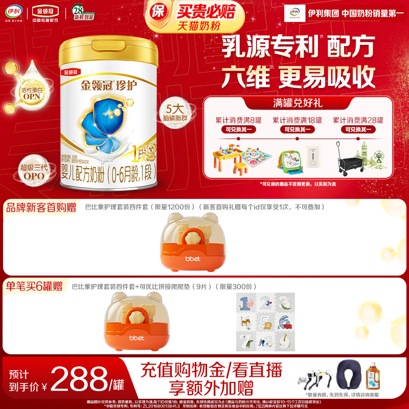 新鲜 伊利金领冠珍护1段0-6月婴儿A2β-酪蛋白配方牛奶粉900g*1罐