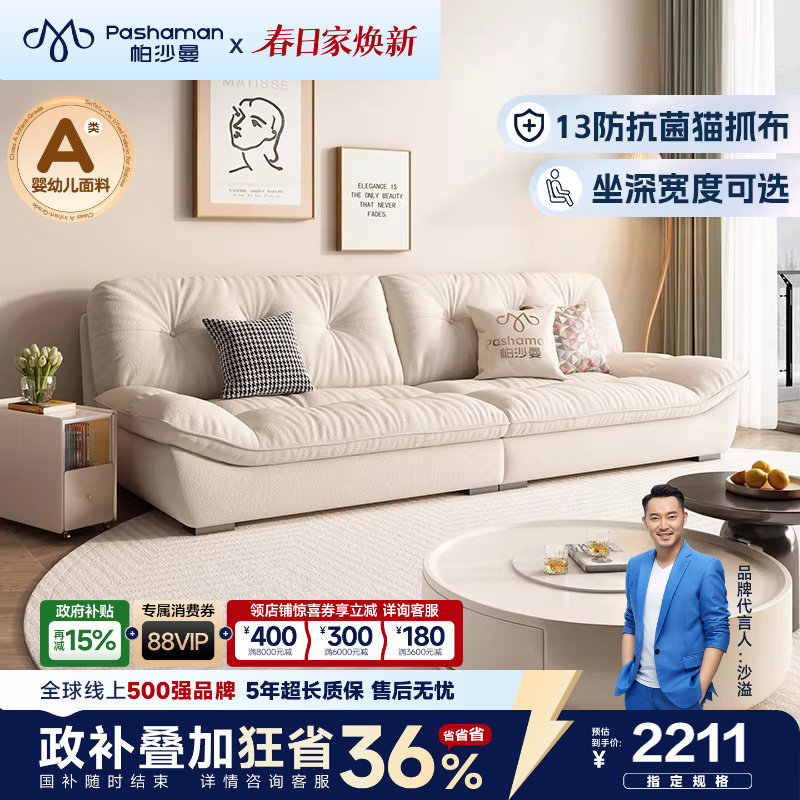 帕沙曼云朵沙发客厅现代简约小户型直排奶油风布艺沙发猫抓布抗菌