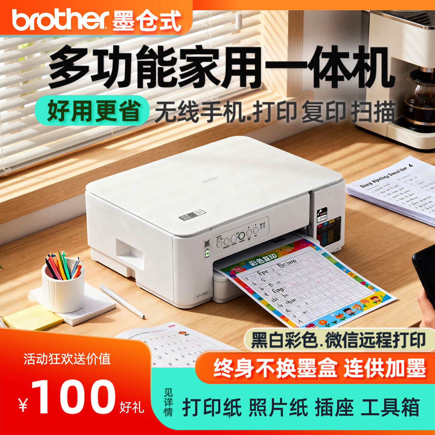 兄弟T436w墨仓式彩色打印机小型家用可连手机打印复印扫描一体机无线wifi远程