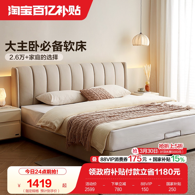 全友家居奶油风琴键双人大床主卧室软包床科技布艺高箱储物落地床