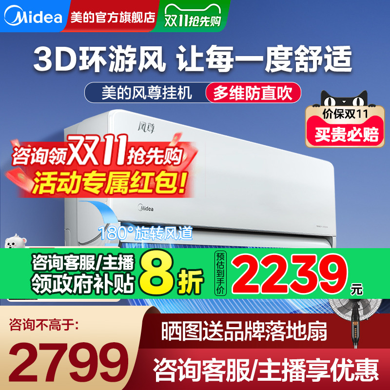 【180度送风】美的空调一级变频1.5匹家用风尊挂机官方旗舰店正品