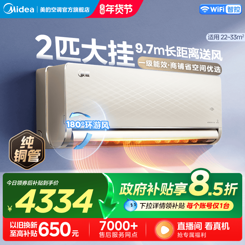 美的空调官方旋耀2匹挂机一级变频冷暖两用客厅壁挂式50大挂MXA1