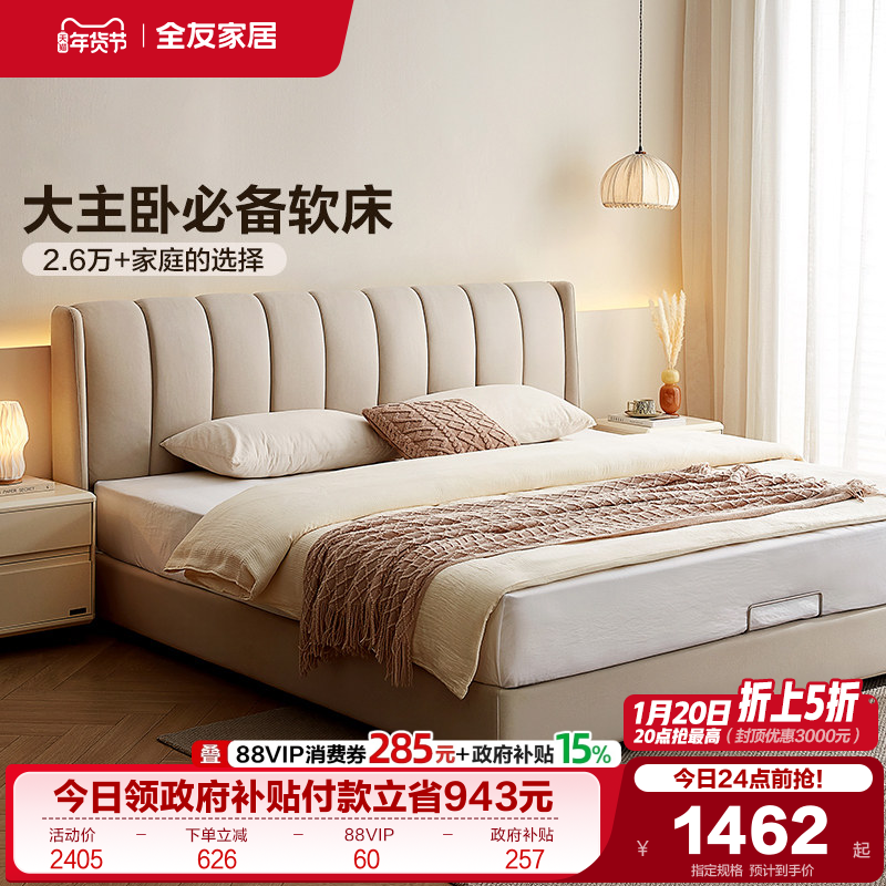 全友家居奶油风琴键双人大床主卧室软包床科技布艺高箱储物落地床