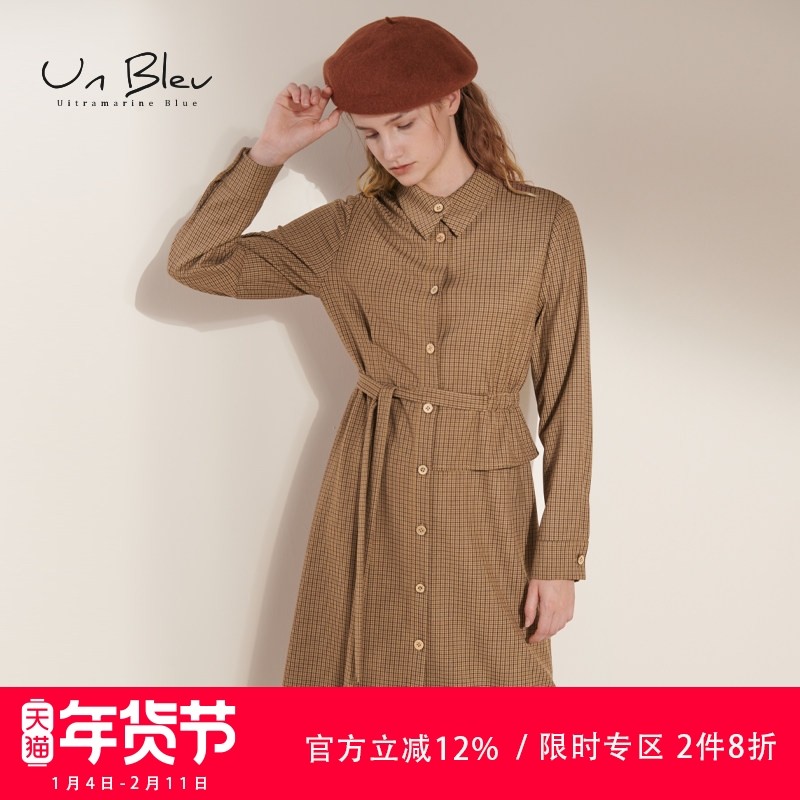 unbleu衬衫连衣裙女2025春秋季新款文艺复古高腰中长款格子长裙女
