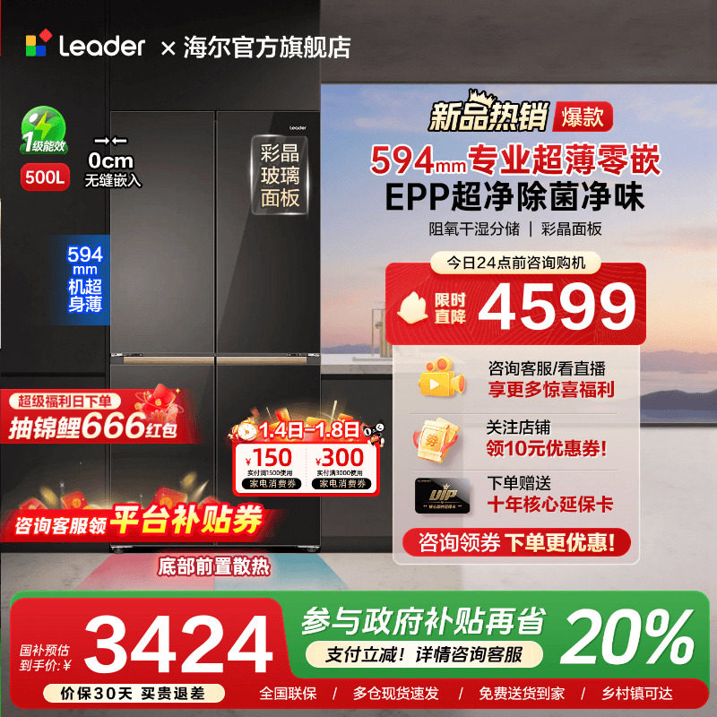 海尔出品统帅500L超薄零嵌入式十字对开四门家用一级能效无霜冰箱