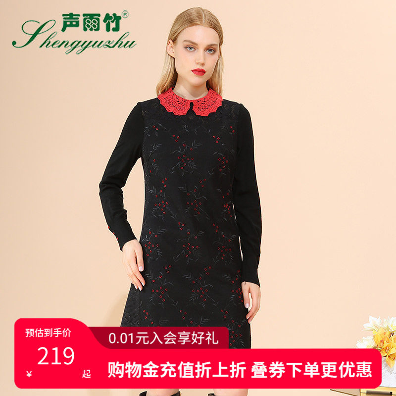 • 泡美丽»»声雨竹秋季气质蕾丝花边翻领刺绣钉珠通勤纽扣长袖中长款连衣裙女